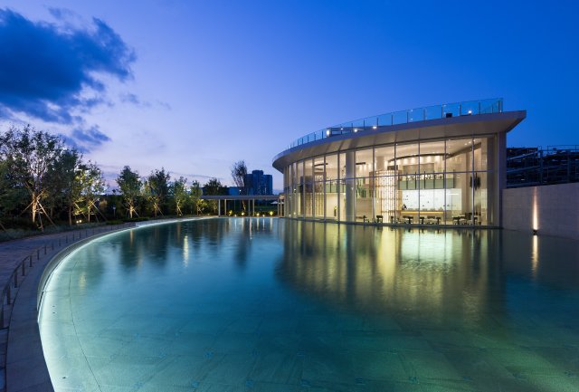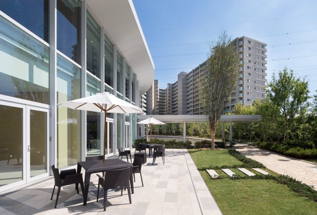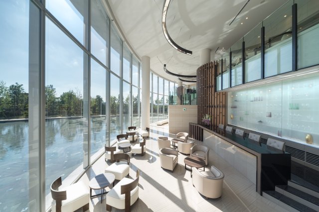 リゾートホテルのようなガラス貼りのカフェラウンジ