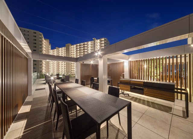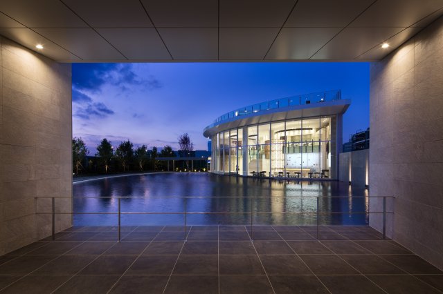 15の共用施設があり、広大な水盤が印象的な「クレストプラザ」(夜)