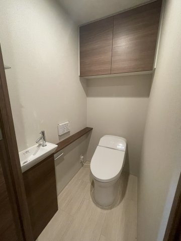 すっきりとしたフォルムのタンクレストイレ(手洗い・カウンター付き)。 ※竣工時のイメージ写真でございます。