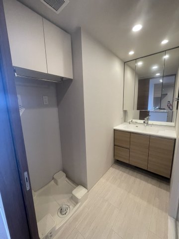 三面鏡(裏収納付き)洗面化粧台・洗濯機置き場の上には便利な棚付き。 ※竣工時のイメージ写真でございます。